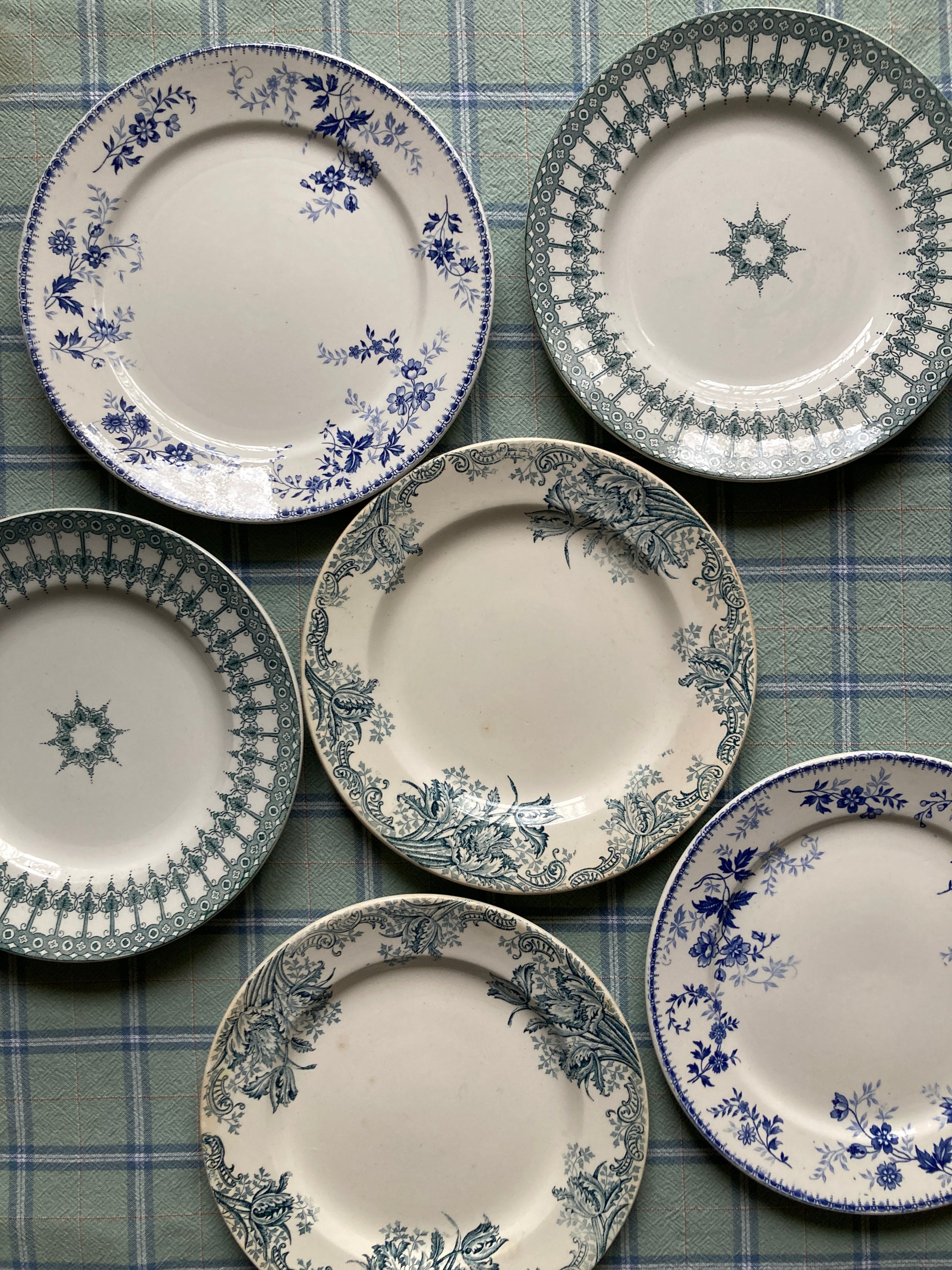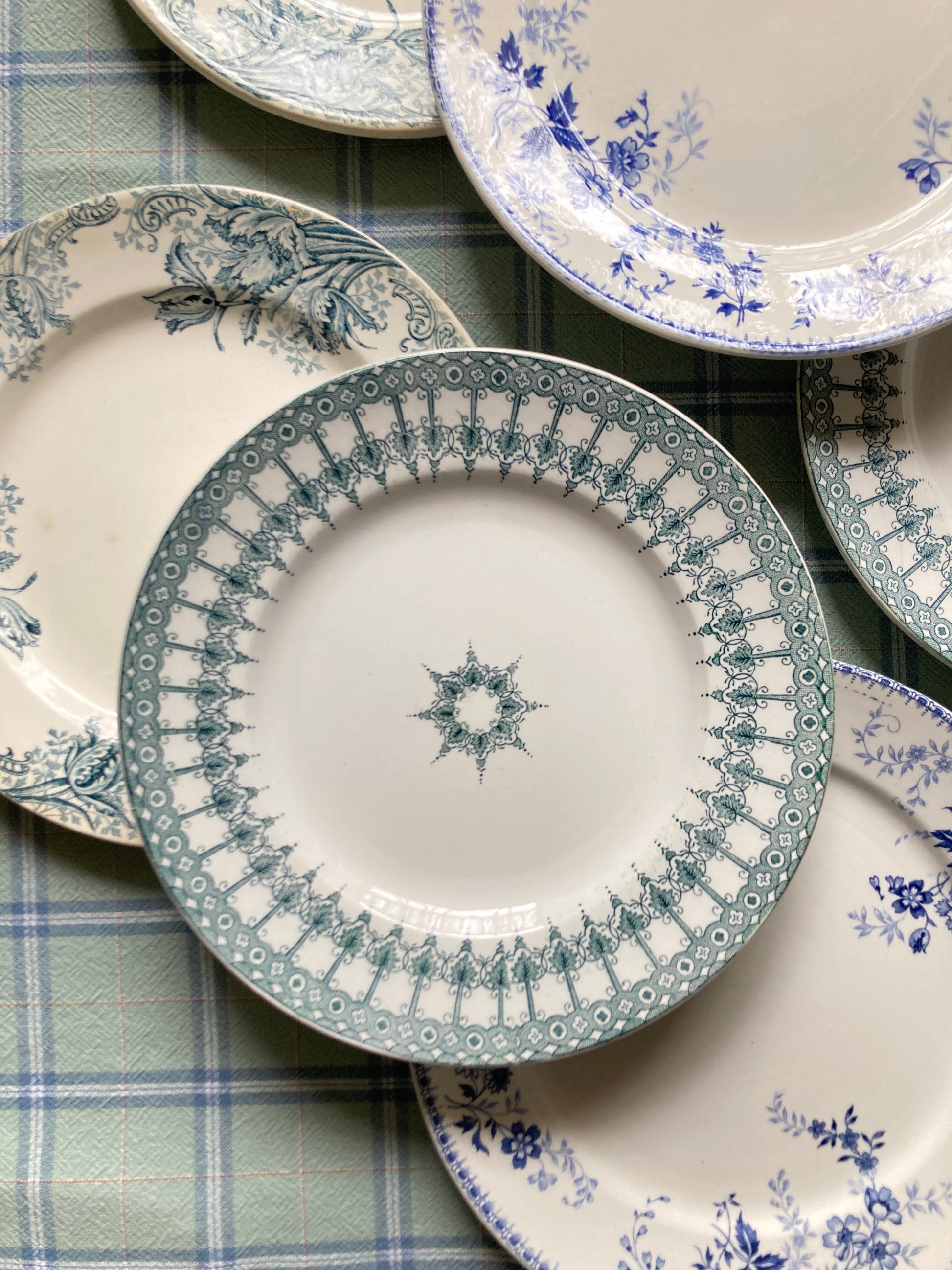 Les compositions d’assiettes dépareillées en terre de fer sont très prisées pour leur charme éclectique et leur esthétique vintage. La terre de fer est une faïence fine apparue en France au XIXe siècle pour imiter la porcelaine tout en étant plus abordable. Elle est souvent ornée de motifs imprimés (bleus, noirs, rouges, verts ou multicolores), parfois rehaussés de décors peints à la main.