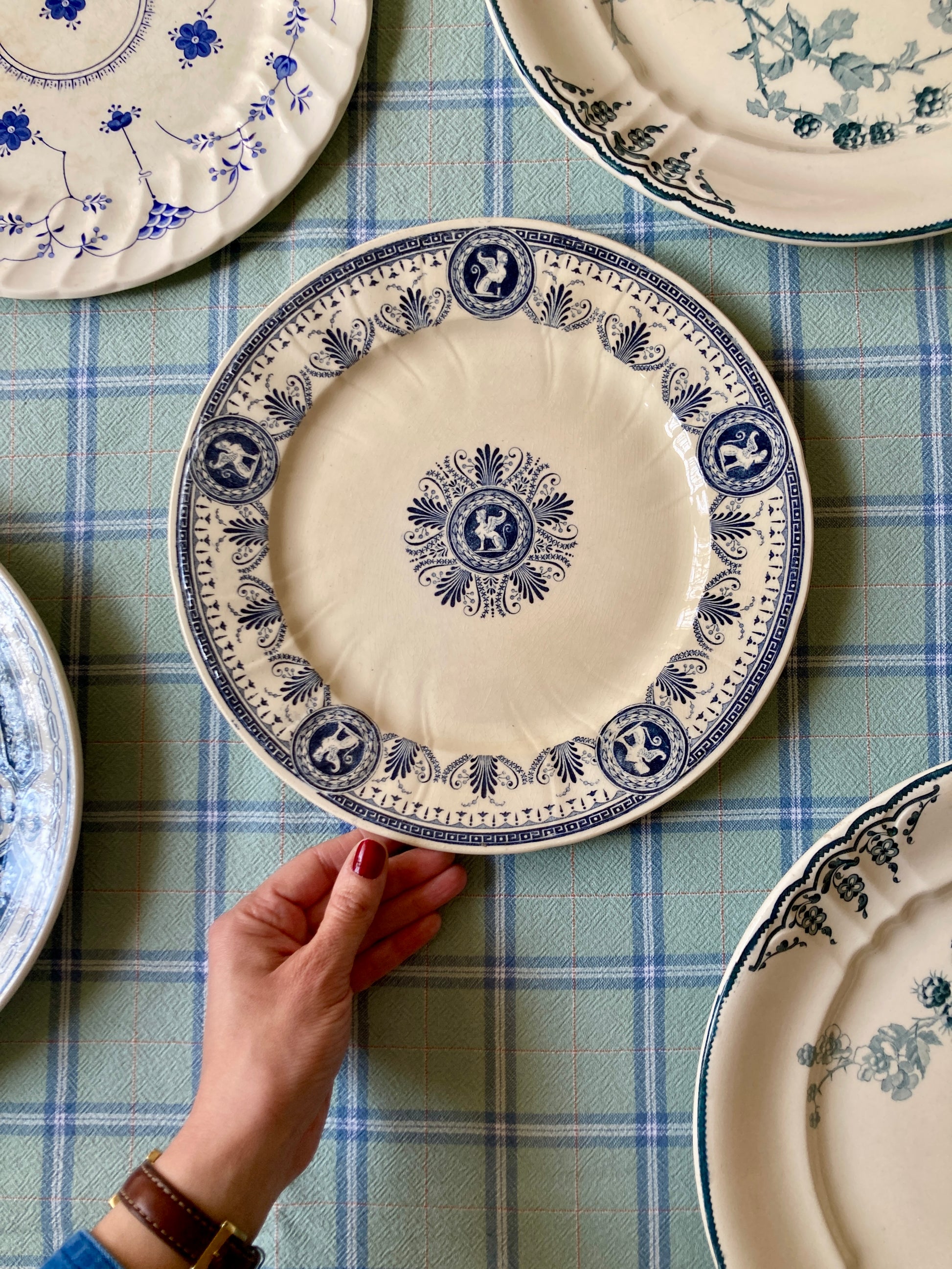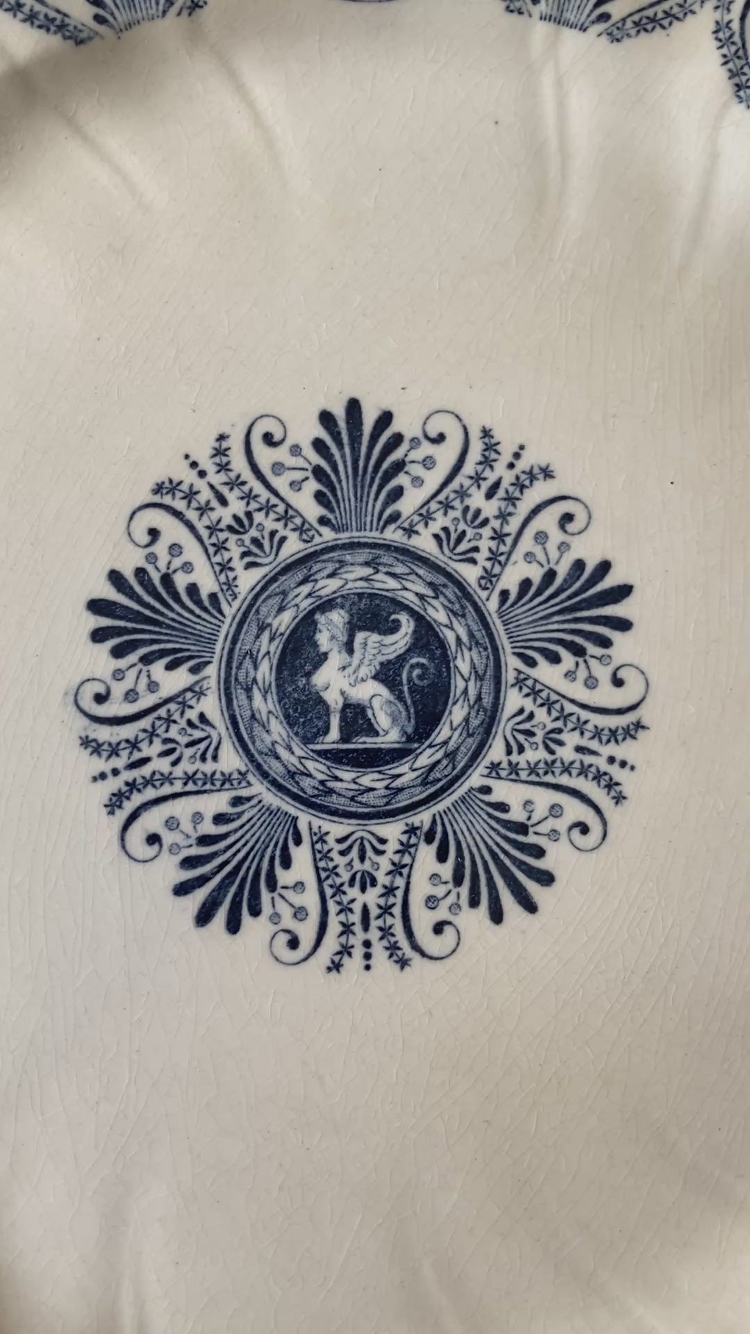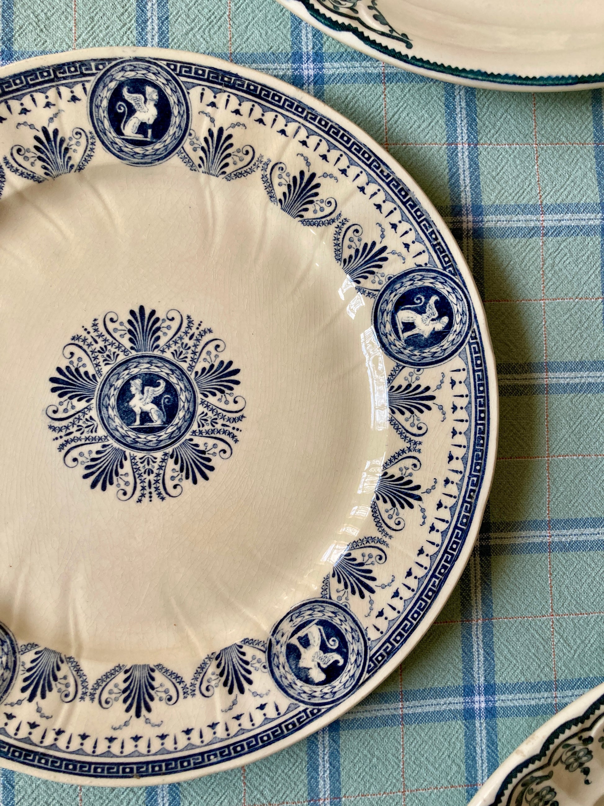 Ce plat ancien de la Manufacture Gien en Terre de Fer présente un style néo-Renaissance ou néo-classique, avec des médaillons contenant des figures mythologiques ou allégoriques entourées d'ornements floraux et géométriques. Ce type de décoration était courant à la fin du XIXème siècle et au début du XXème siècle.