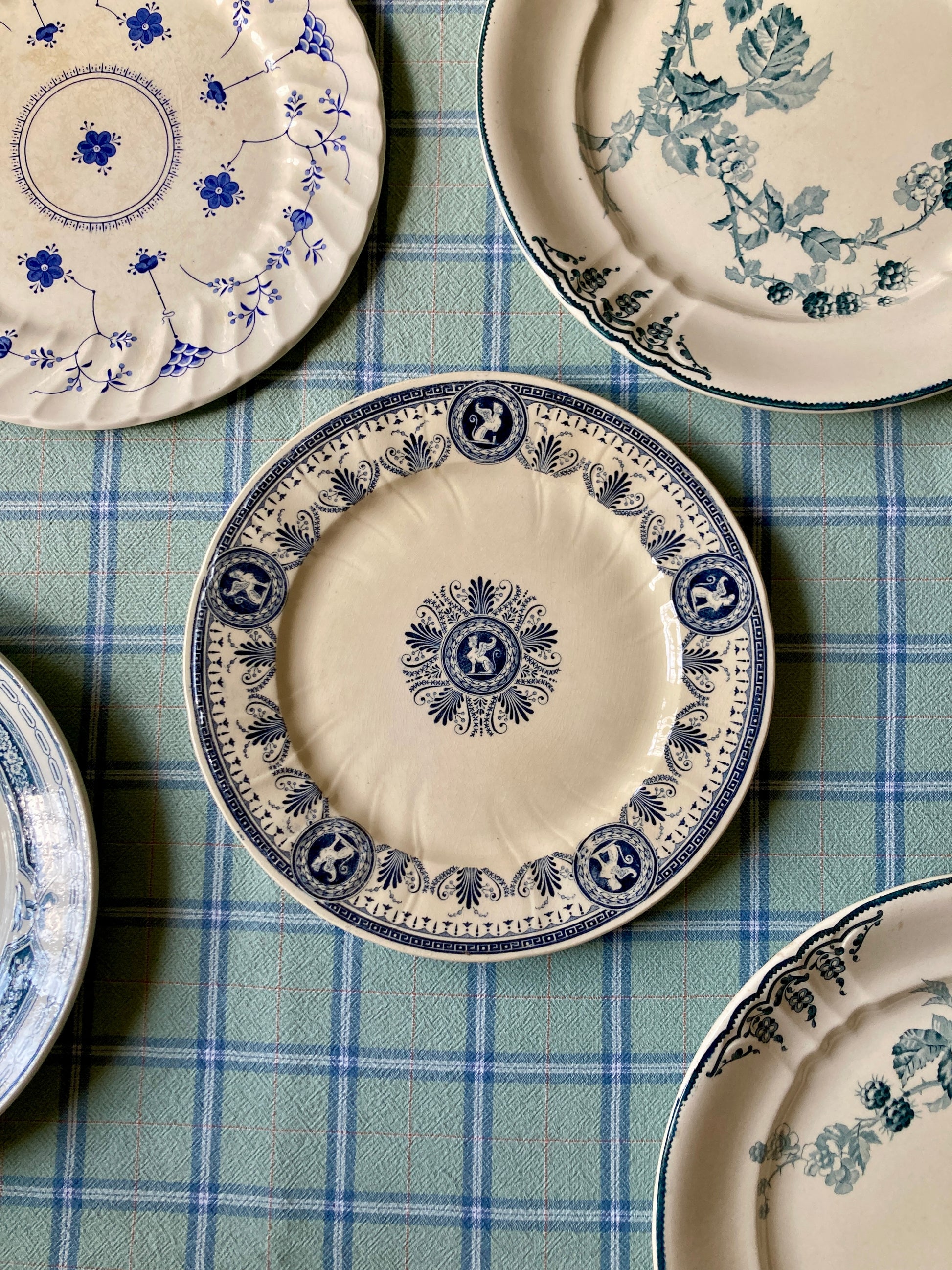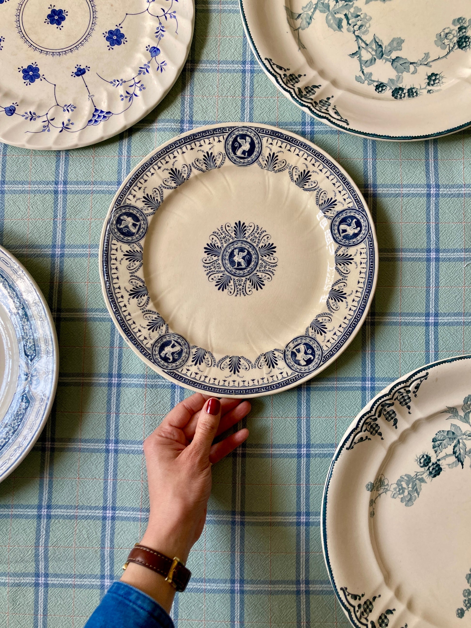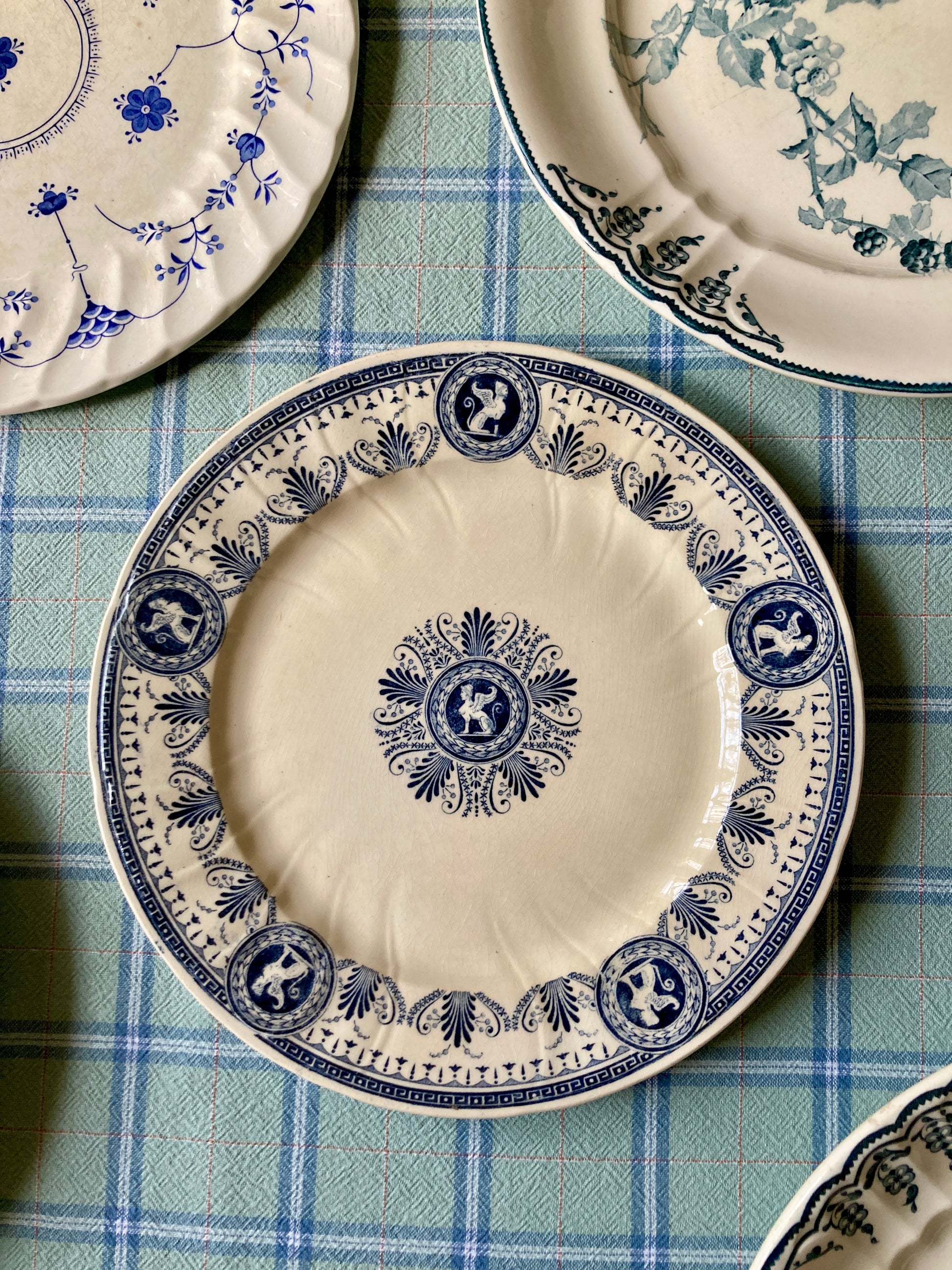 Ce plat ancien de la Manufacture Gien en Terre de Fer présente un style néo-Renaissance ou néo-classique, avec des médaillons contenant des figures mythologiques ou allégoriques entourées d'ornements floraux et géométriques. Ce type de décoration était courant à la fin du XIXème siècle et au début du XXème siècle.