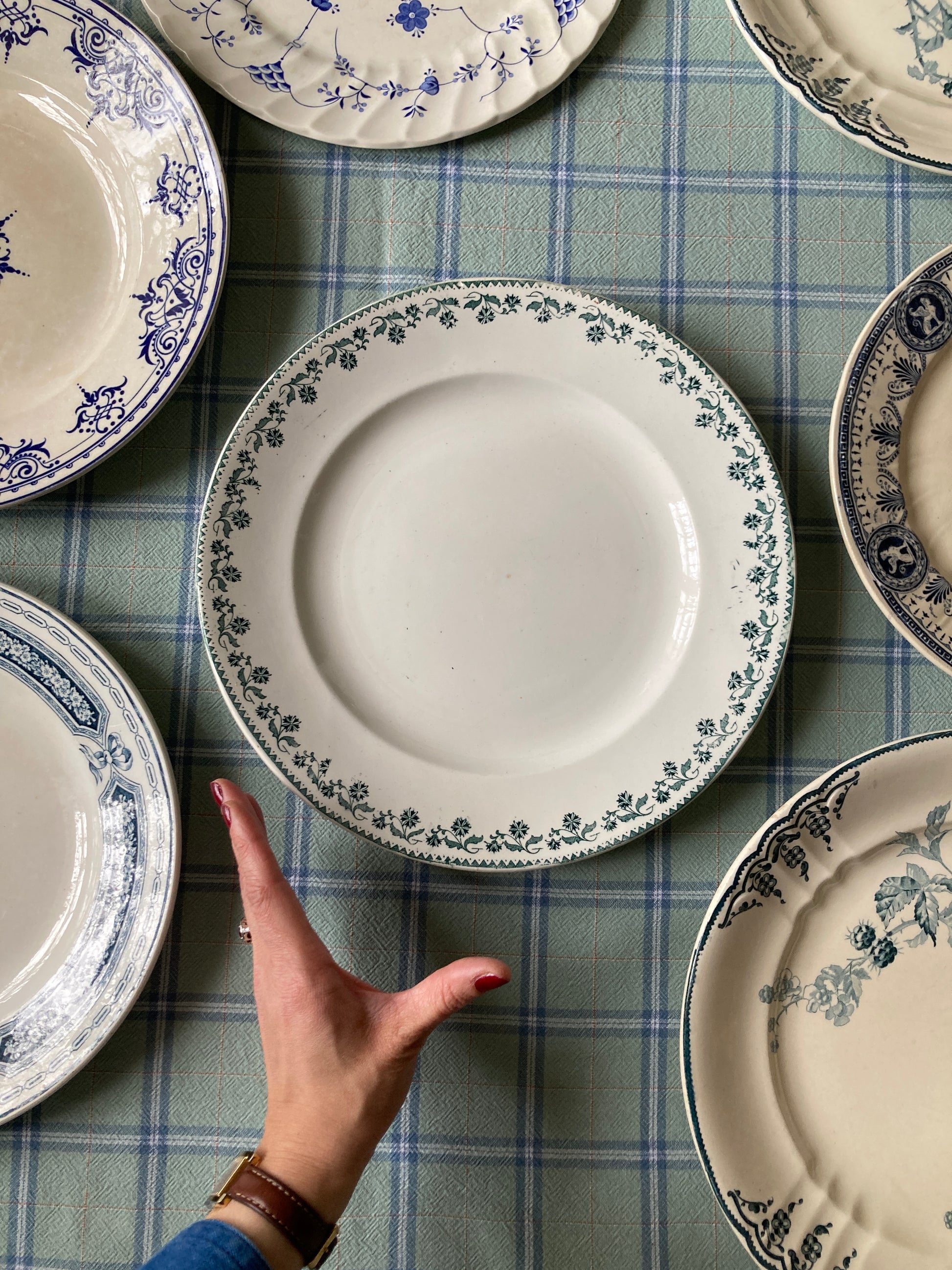 Le service ancien “Georgette” provient d'une collection de vaisselle en faïence produite par la manufacture française Moulin des Loups & Hamage Nord, située dans la ville d' Orchies. Ce modèle, date des années 1930, et se distingue par son décor de guirlandes de fleurs stylisées de couleur verte sur un fond crème.