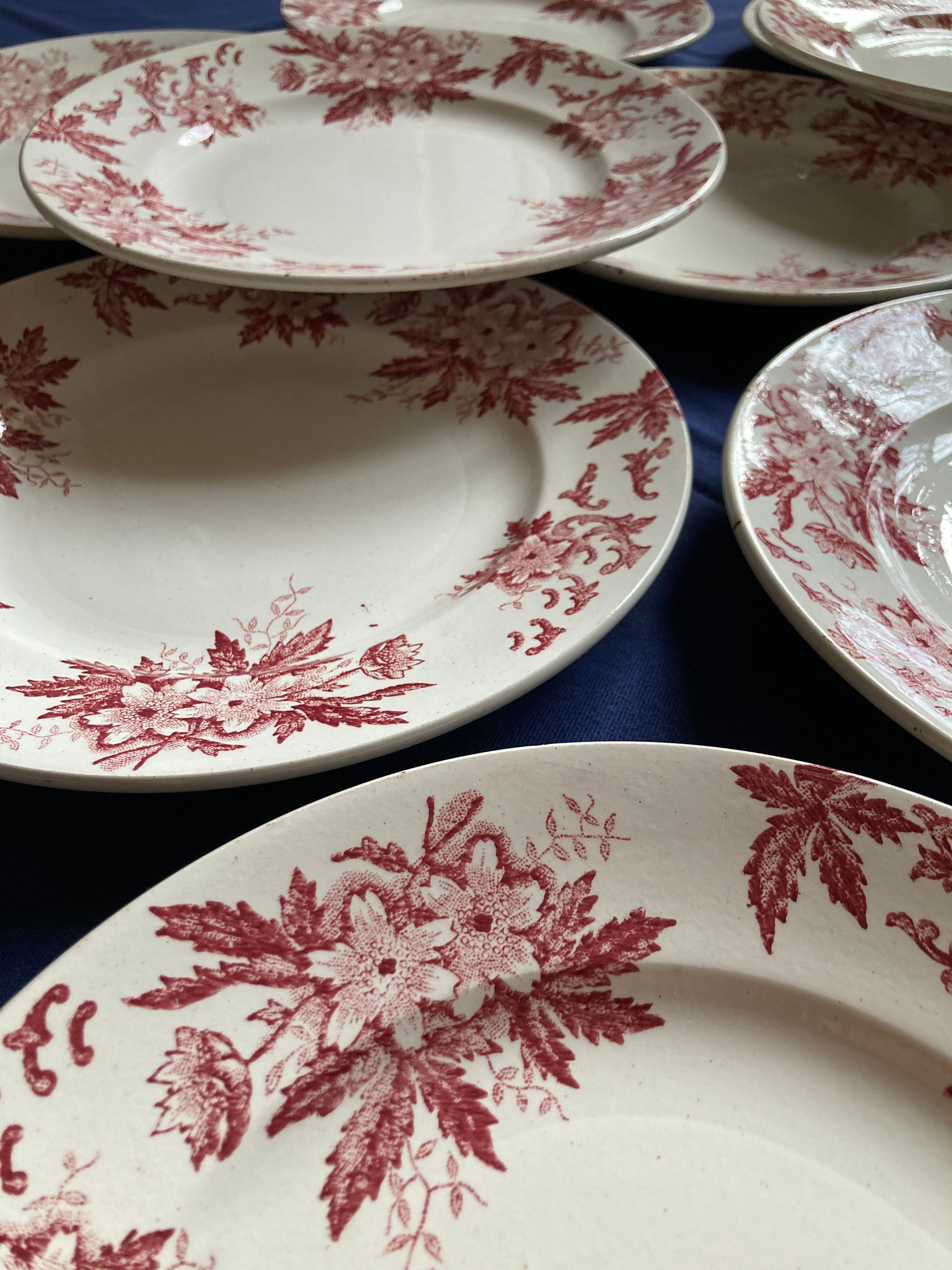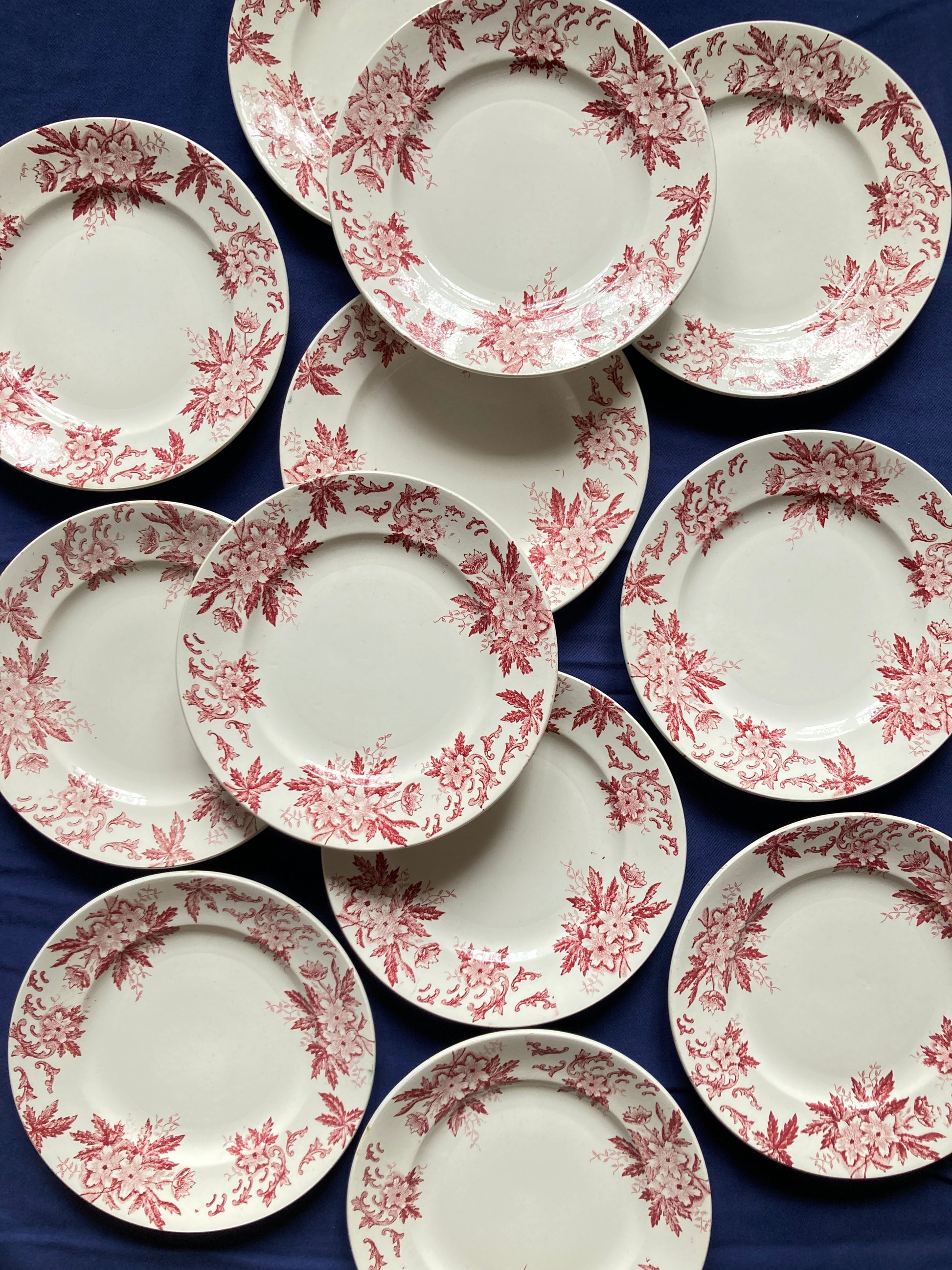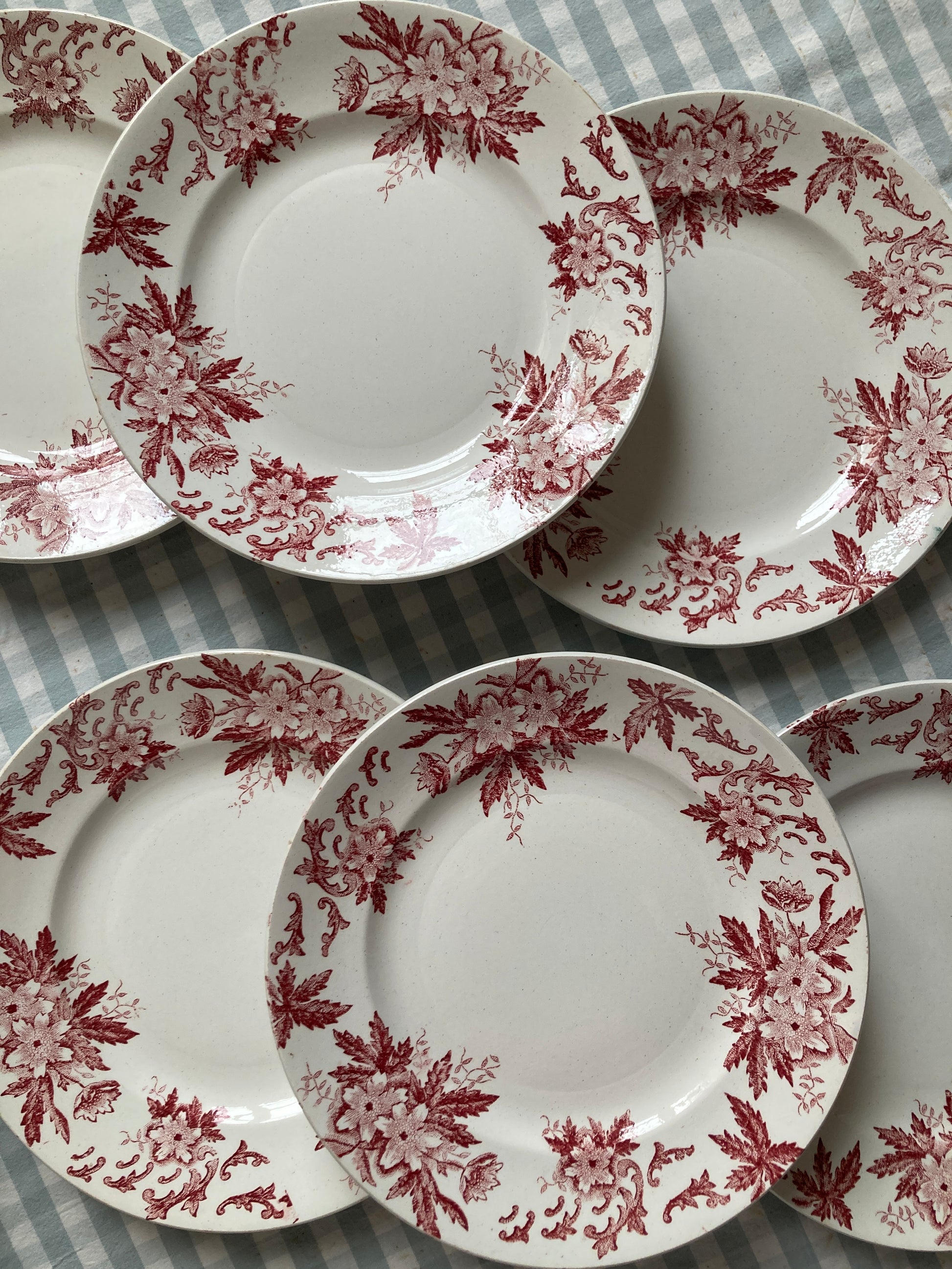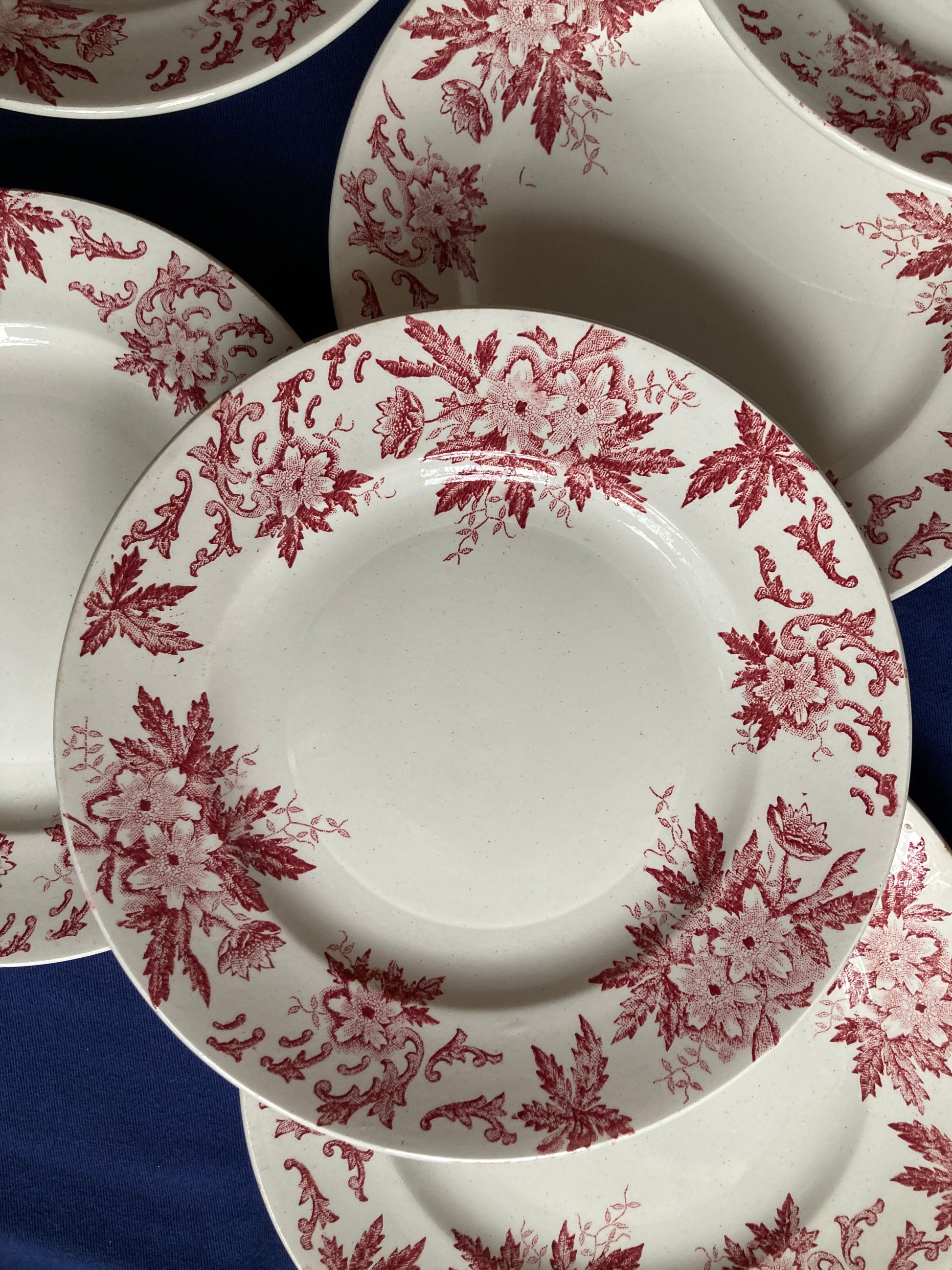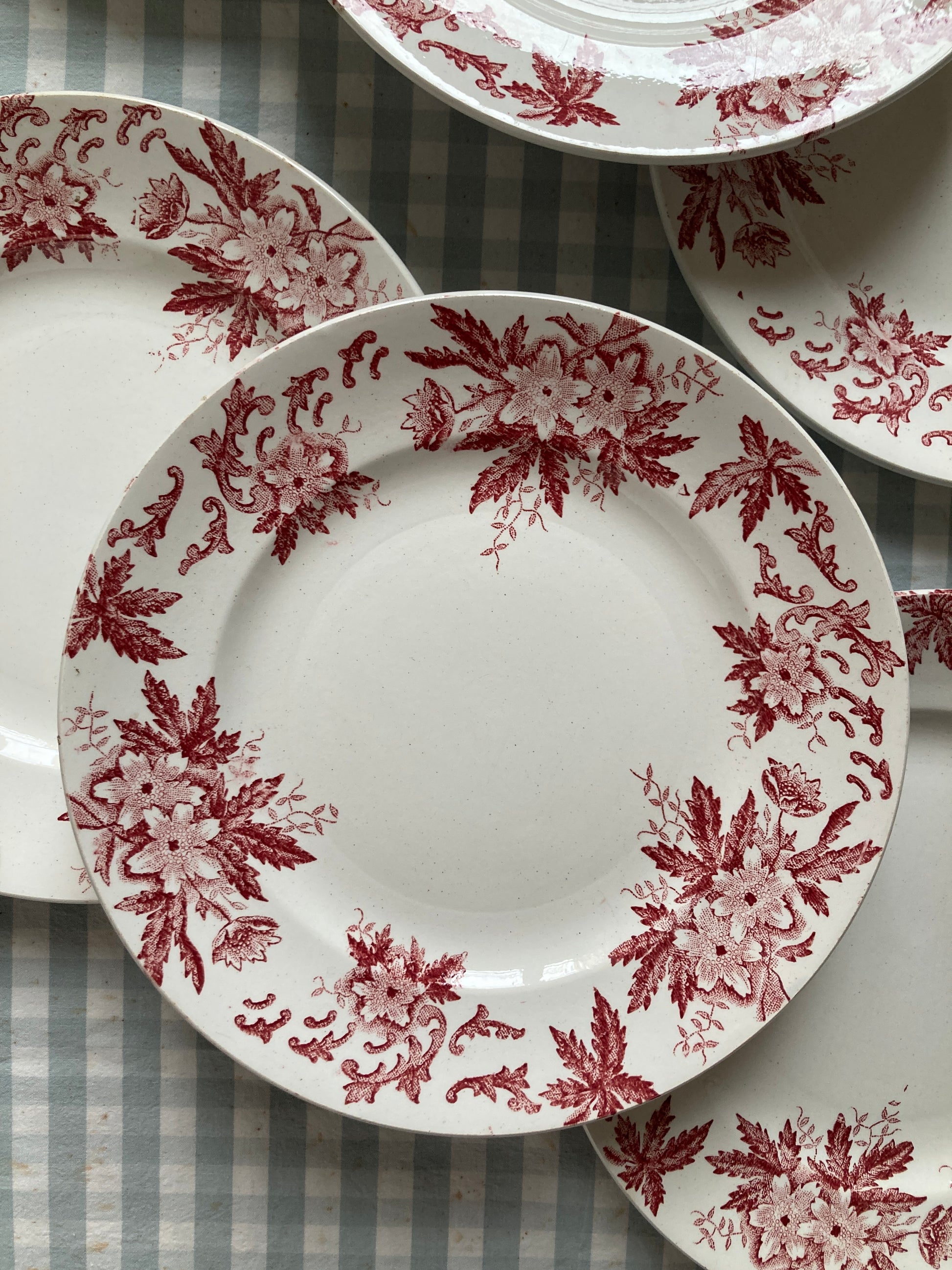 Ces assiettes anciennes sont élégantes et chargées d'histoire. Elles ont été produites dans les années 1896 à 1952. Il s'agissait d'une période durant laquelle la filiale Hamage s'associa à la Manufacture d'origine Saint Amand les Eaux. Ces assiettes anciennes sont le témoignage d'un savoir faire régional du Nord de la France. Ces assiettes en Terre de Fer rouges seront idéales pour décorer vos tables romantiques, vintage, shabby chic; elles seront également parfaites si vous les utiliser en décoration murale ou comme base de collection.