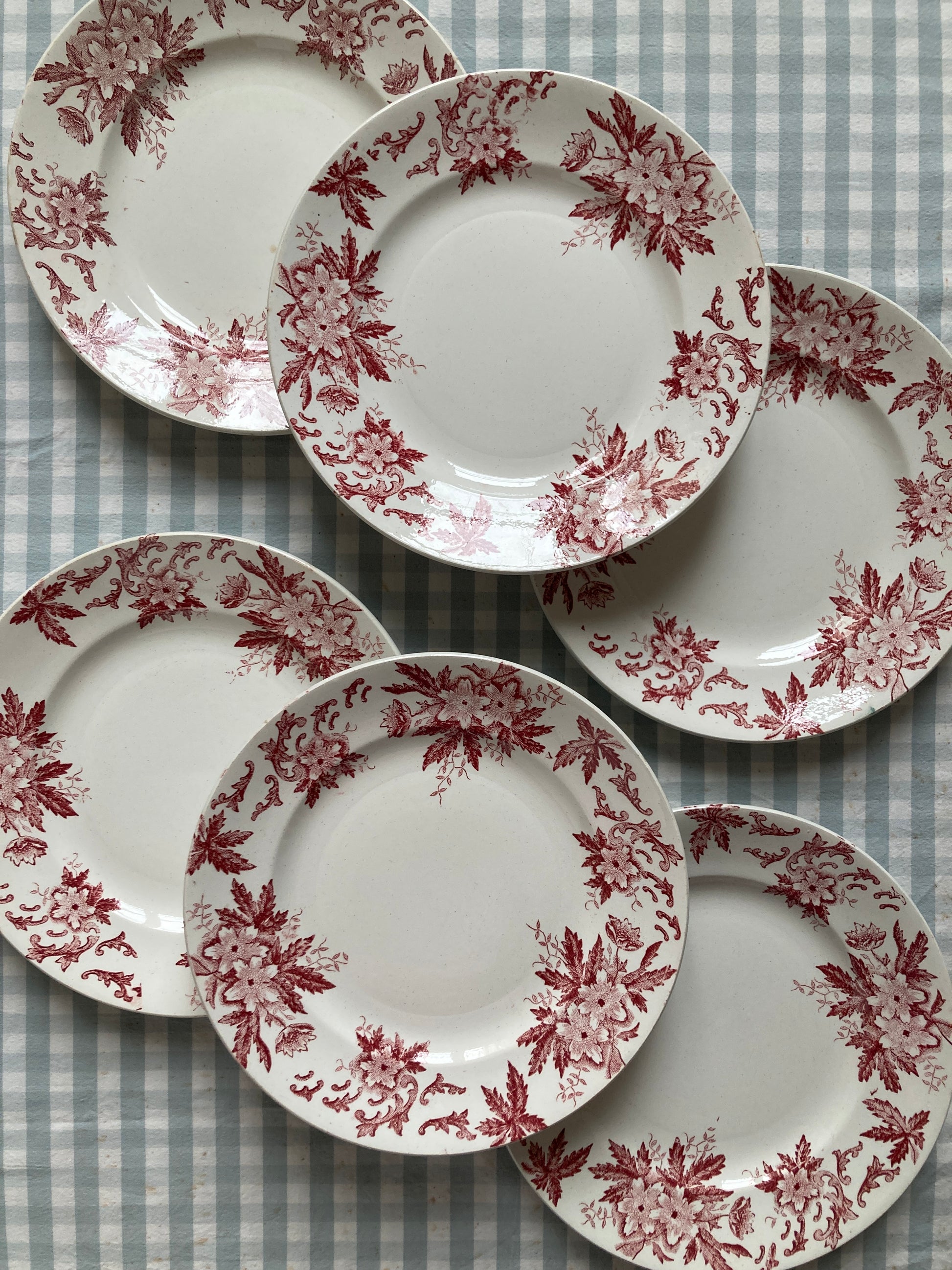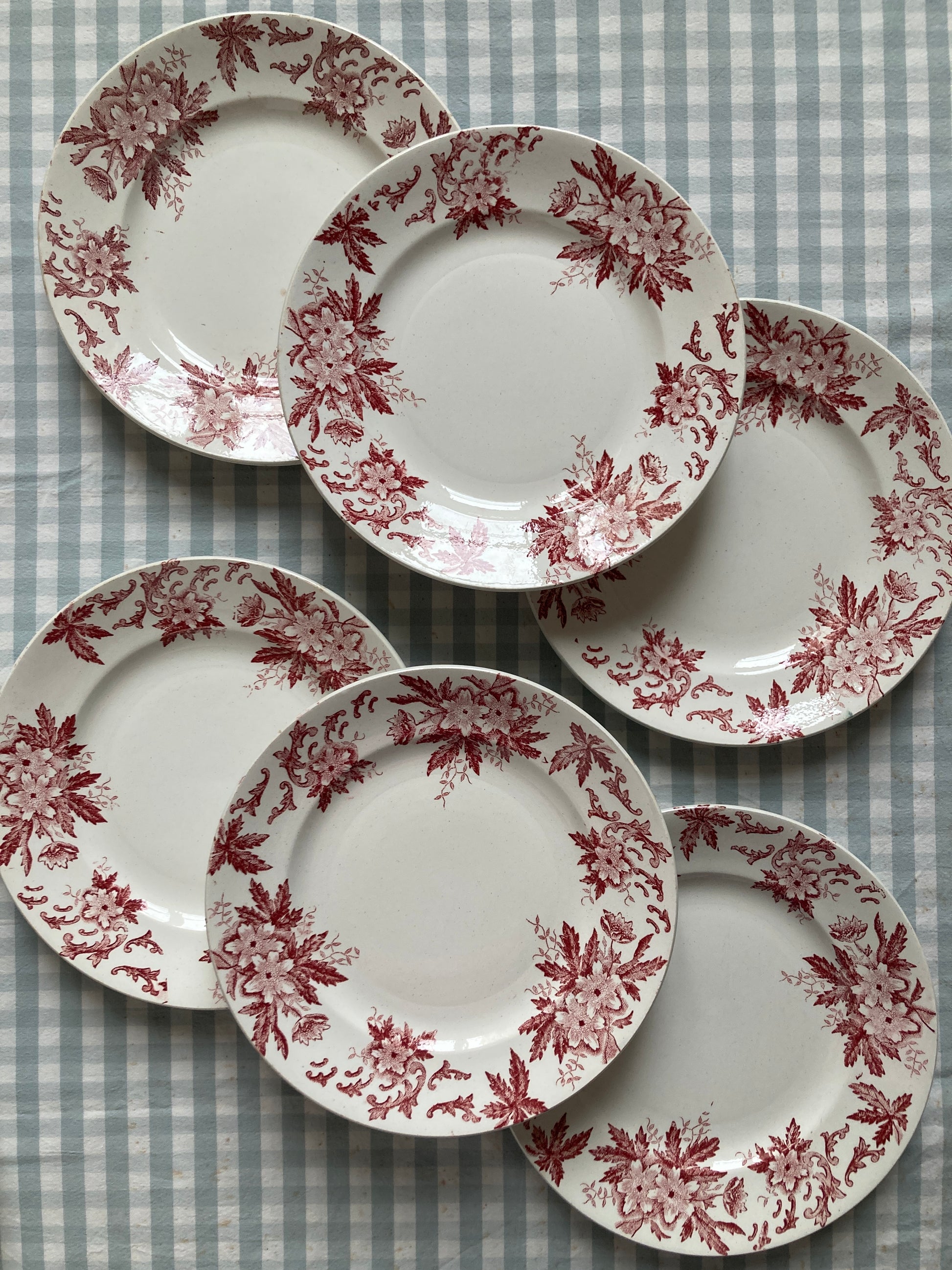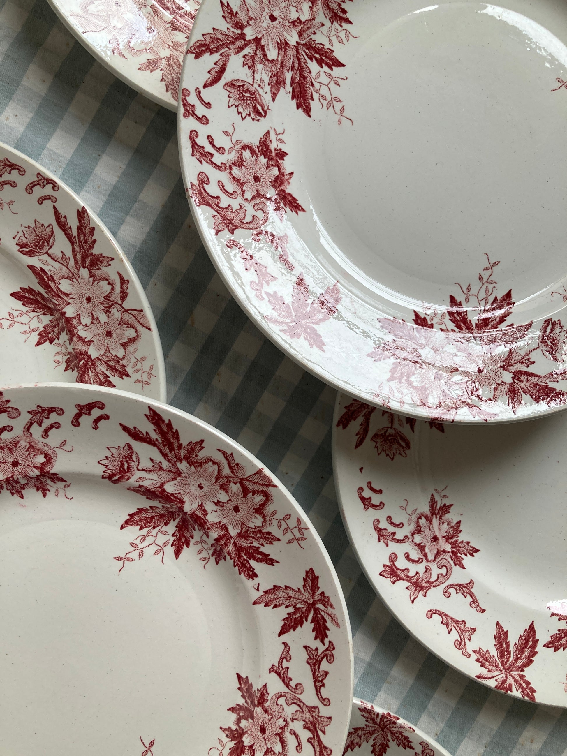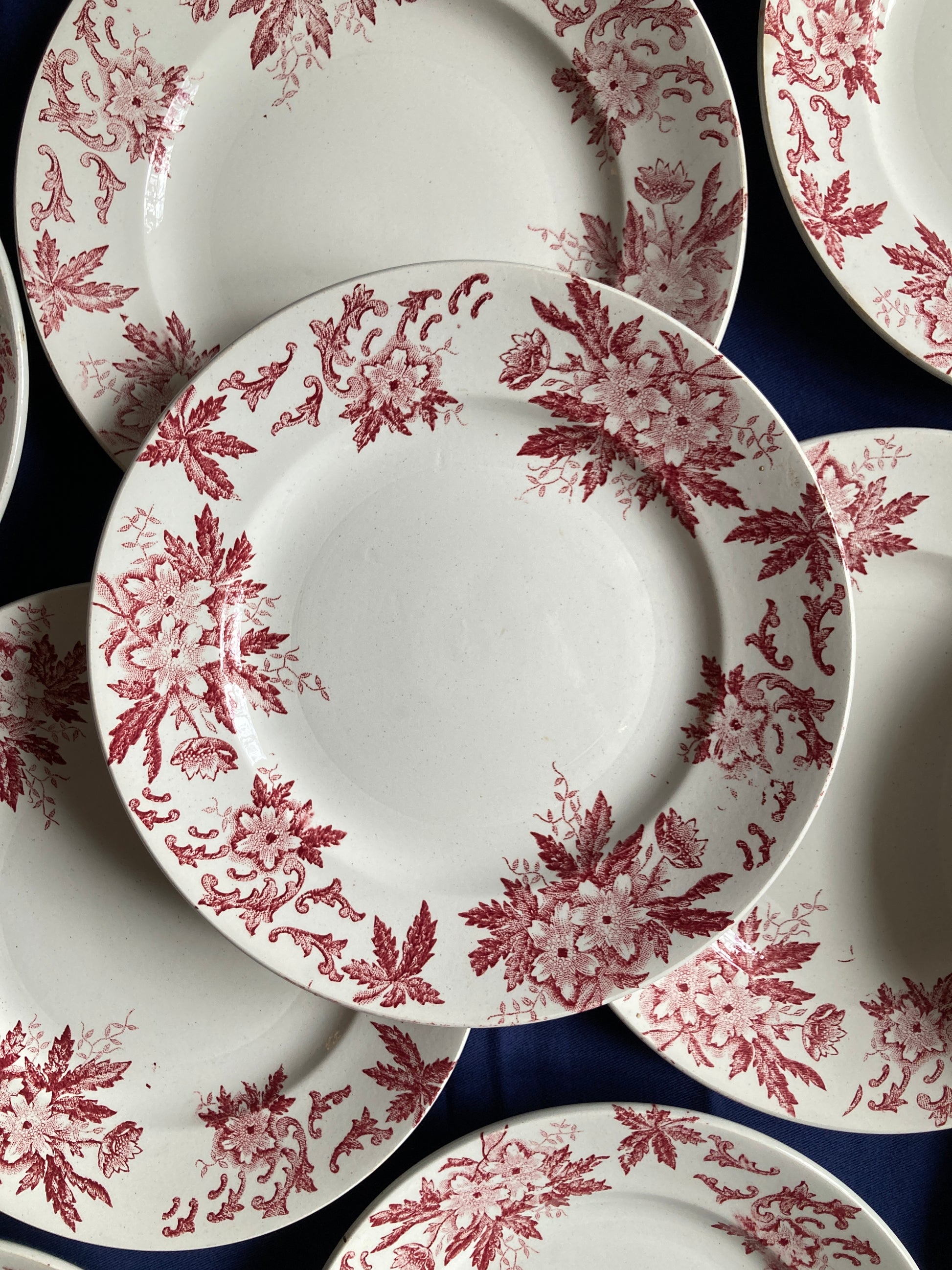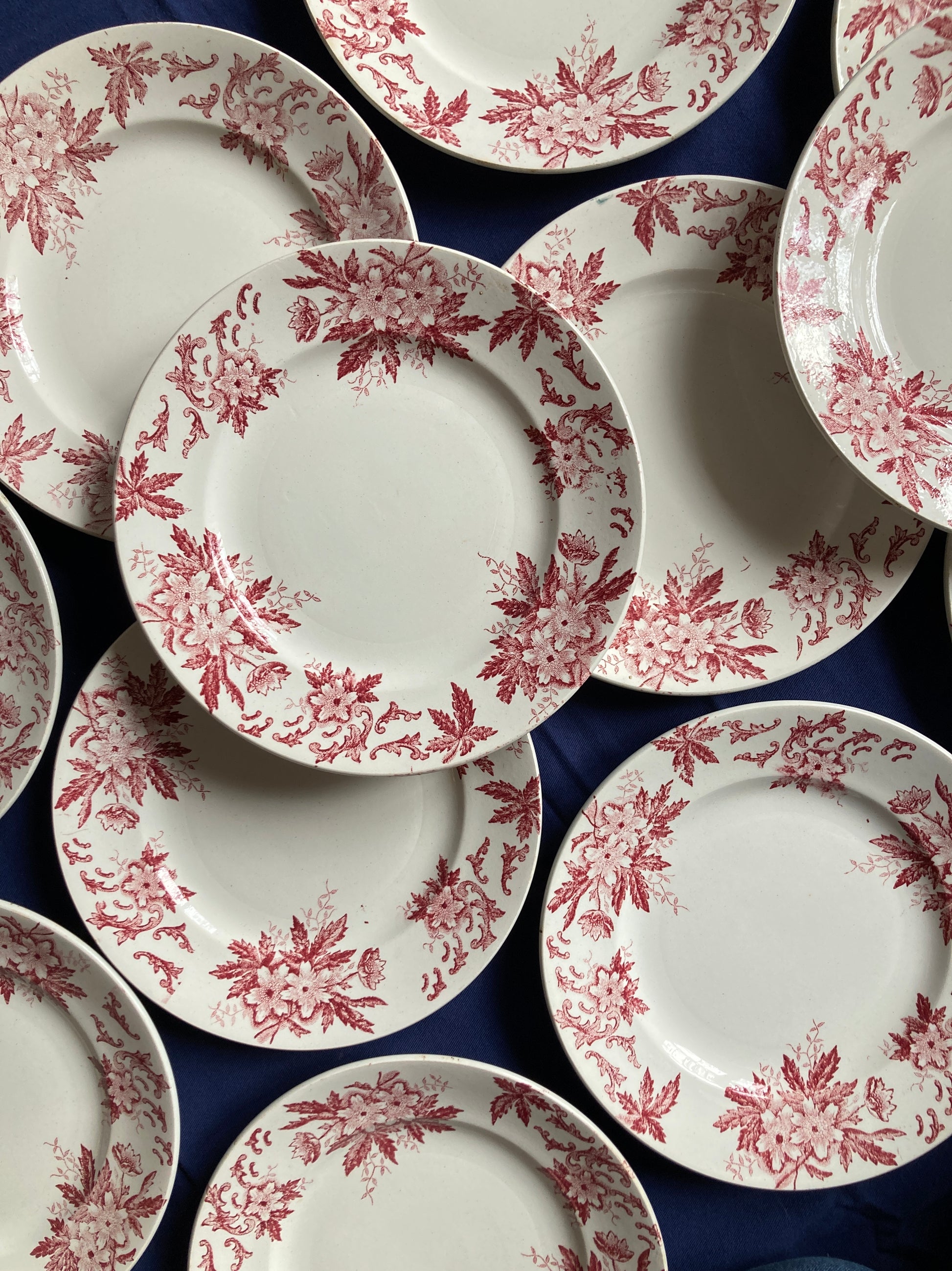 Ces assiettes anciennes sont élégantes et chargées d'histoire. Elles ont été produites dans les années 1896 à 1952. Il s'agissait d'une période durant laquelle la filiale Hamage s'associa à la Manufacture d'origine Saint Amand les Eaux. Ces assiettes anciennes sont le témoignage d'un savoir faire régional du Nord de la France. Ces assiettes en Terre de Fer rouges seront idéales pour décorer vos tables romantiques, vintage, shabby chic; elles seront également parfaites si vous les utiliser en décoration murale ou comme base de collection.