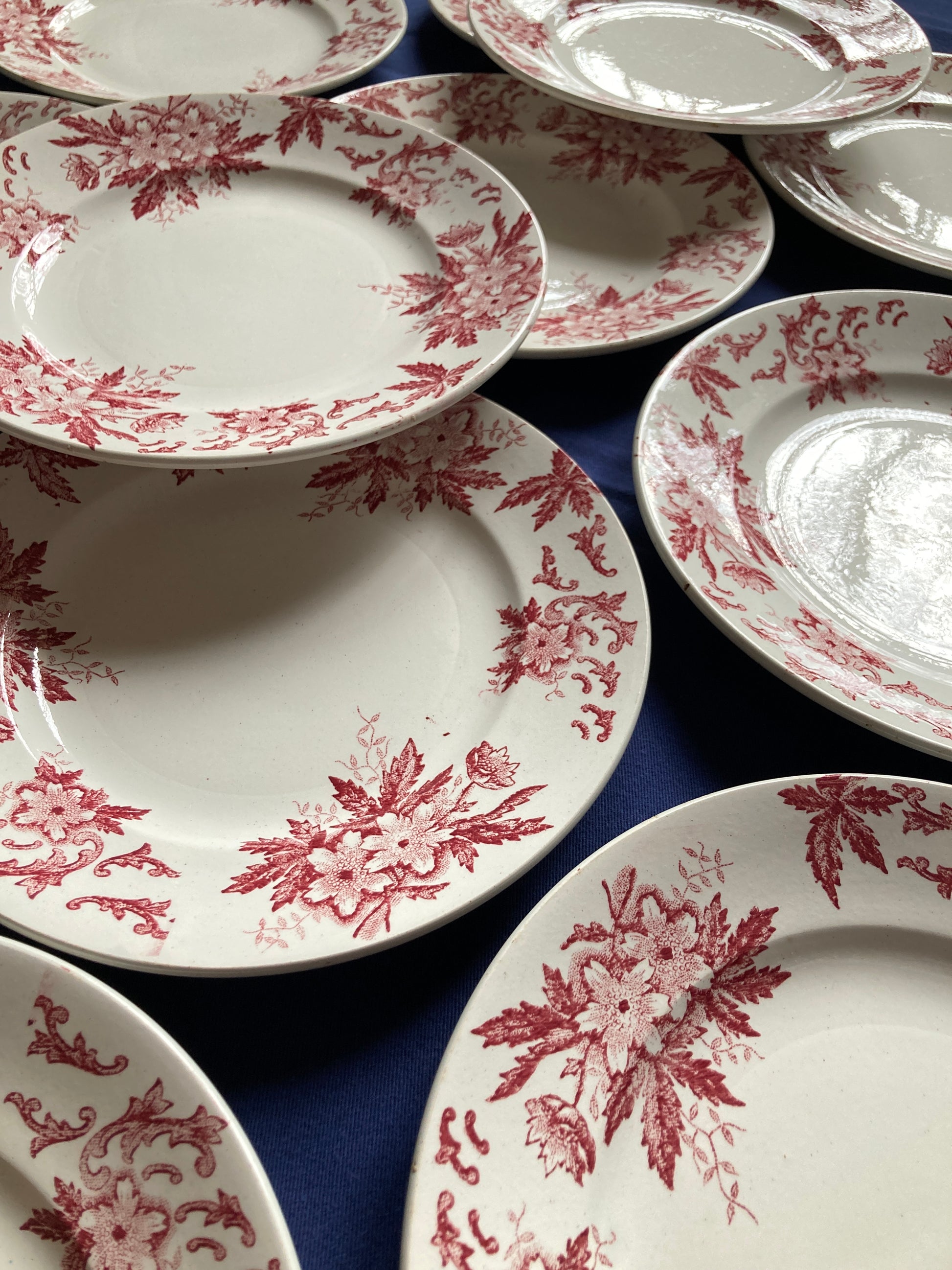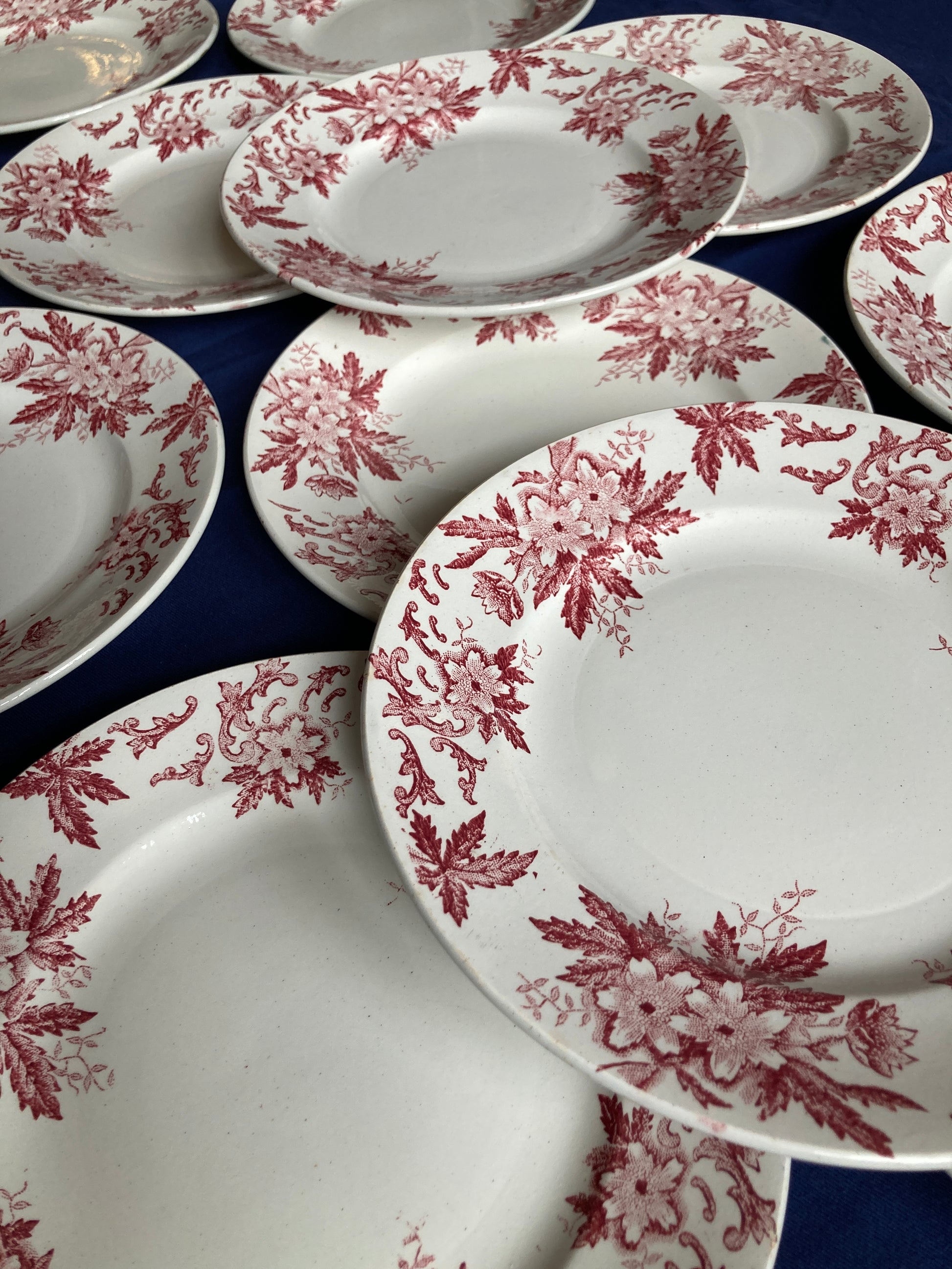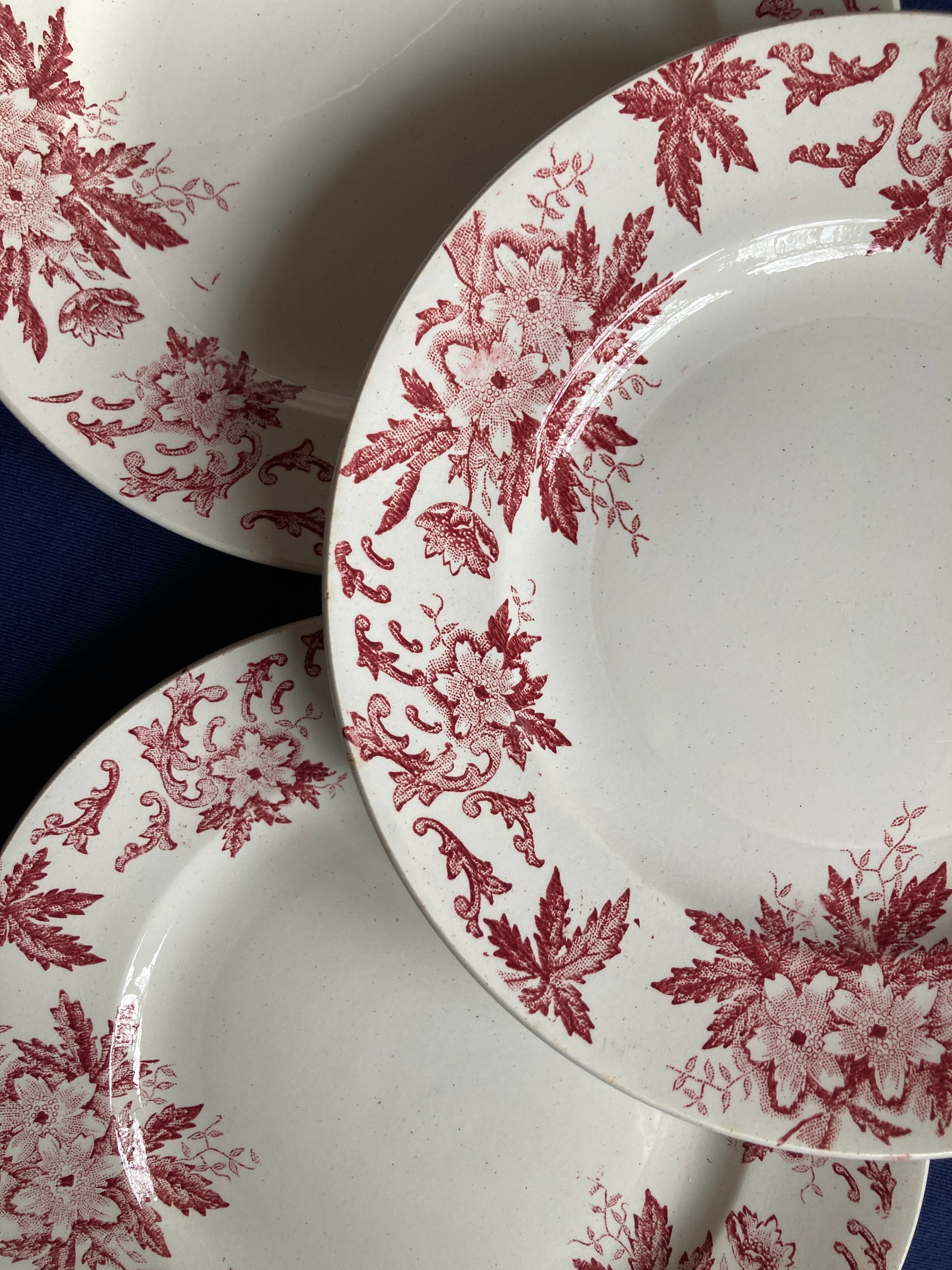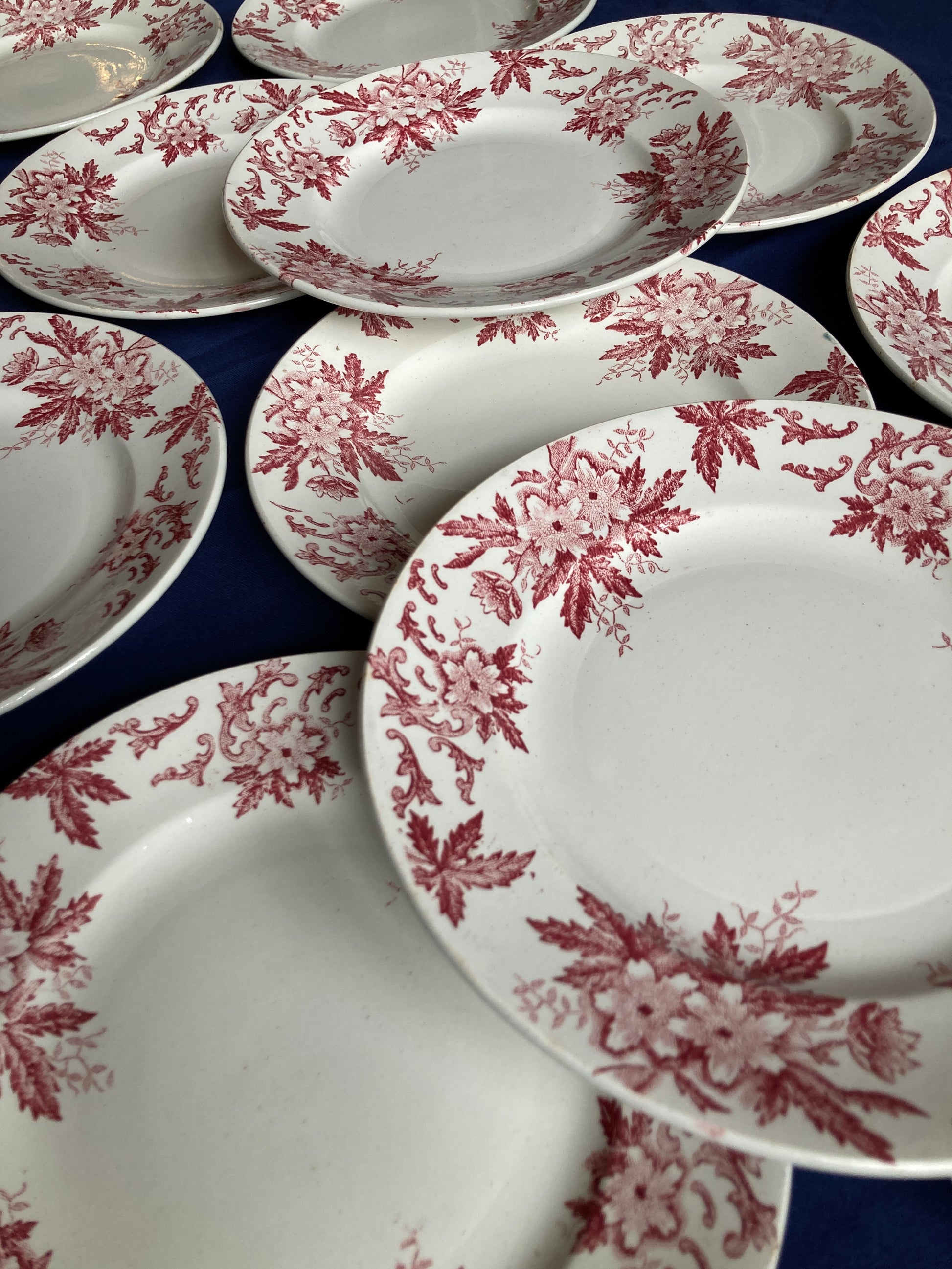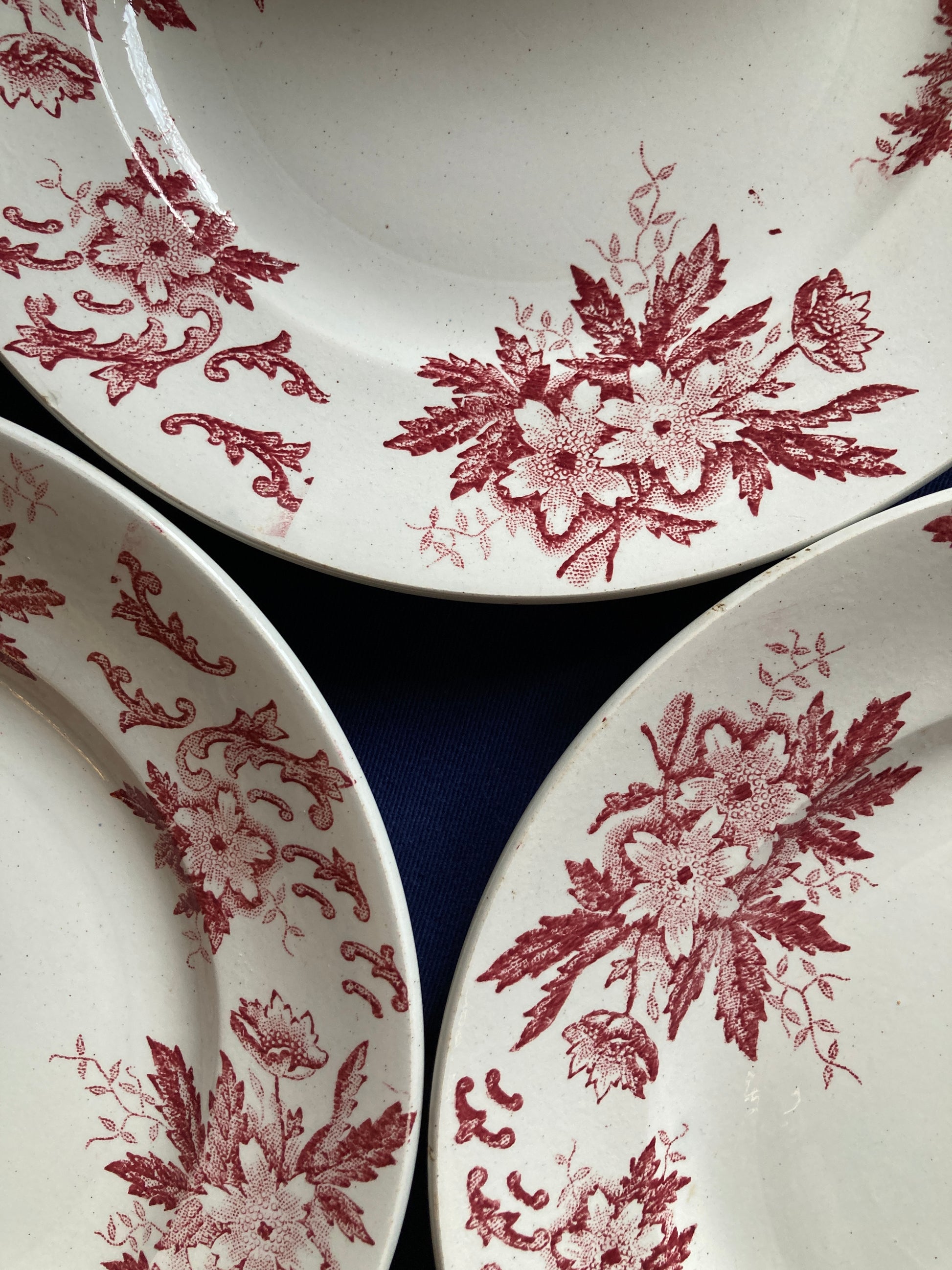 Ces assiettes anciennes sont élégantes et chargées d'histoire. Elles ont été produites dans les années 1896 à 1952. Il s'agissait d'une période durant laquelle la filiale Hamage s'associa à la Manufacture d'origine Saint Amand les Eaux. Ces assiettes anciennes sont le témoignage d'un savoir faire régional du Nord de la France. Ces assiettes en Terre de Fer rouges seront idéales pour décorer vos tables romantiques, vintage, shabby chic; elles seront également parfaites si vous les utiliser en décoration murale ou comme base de collection.