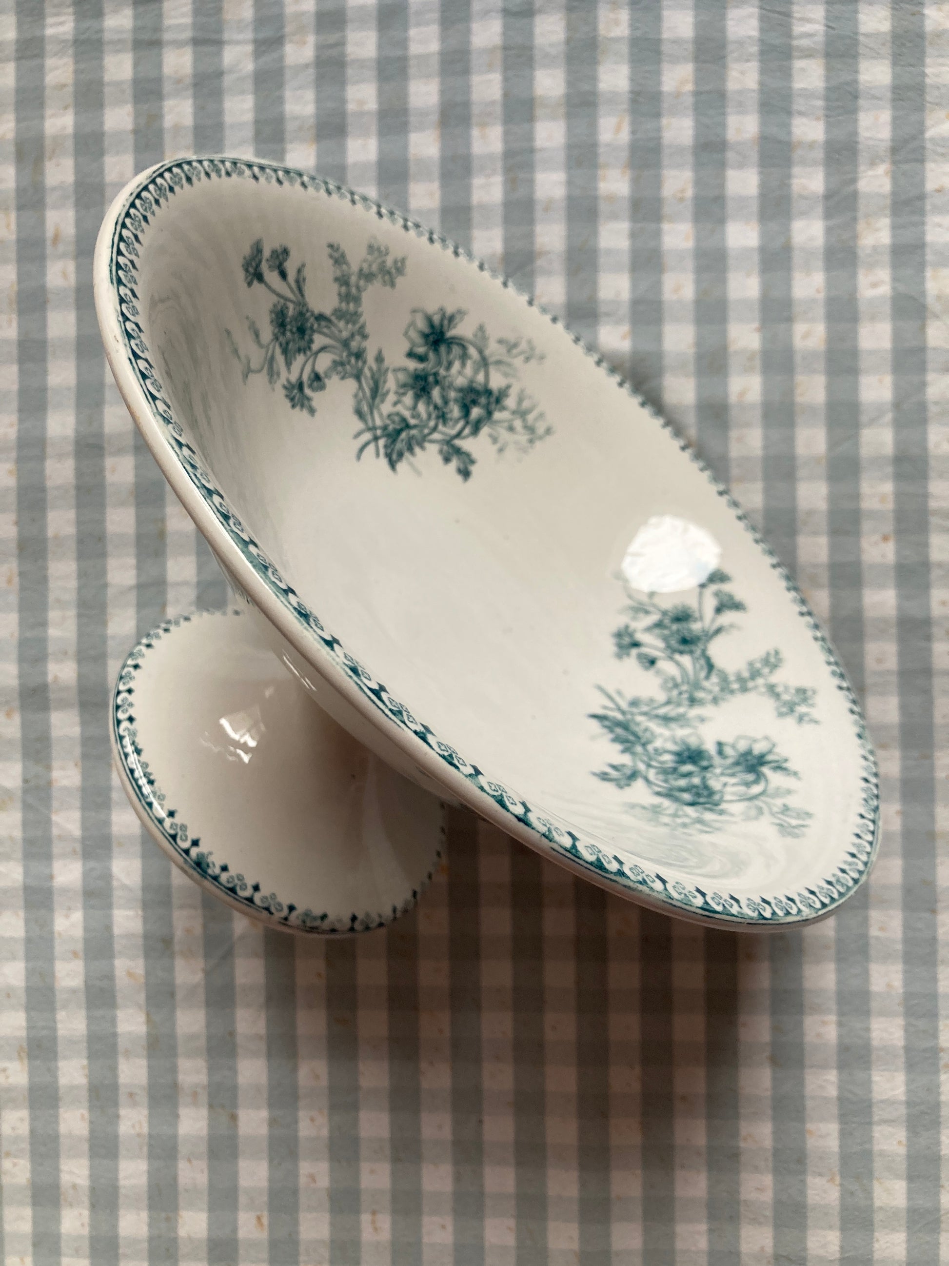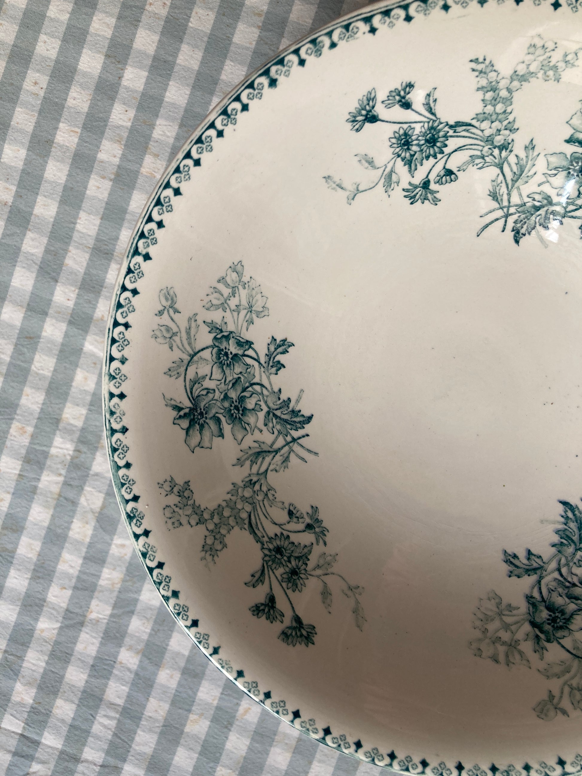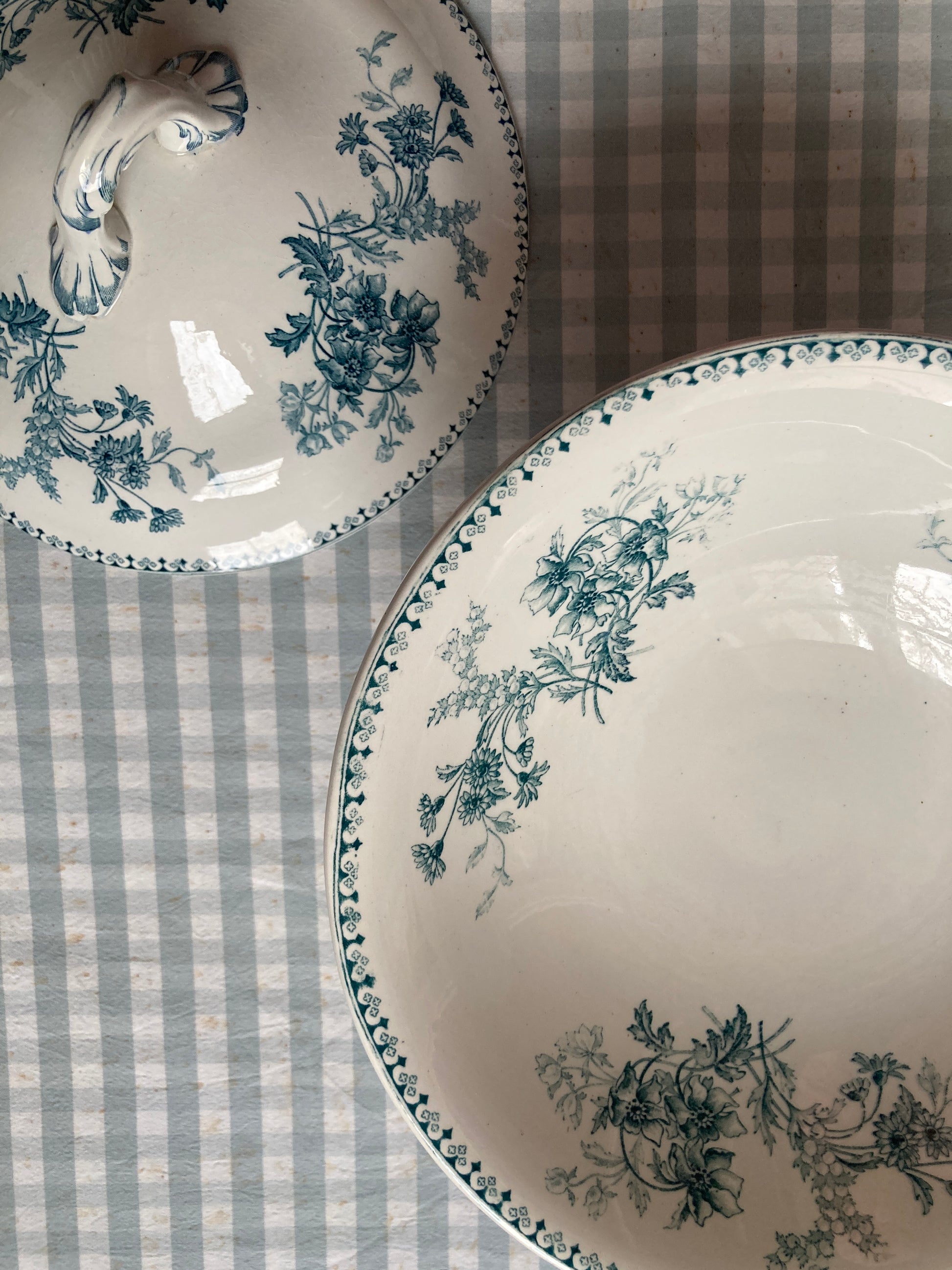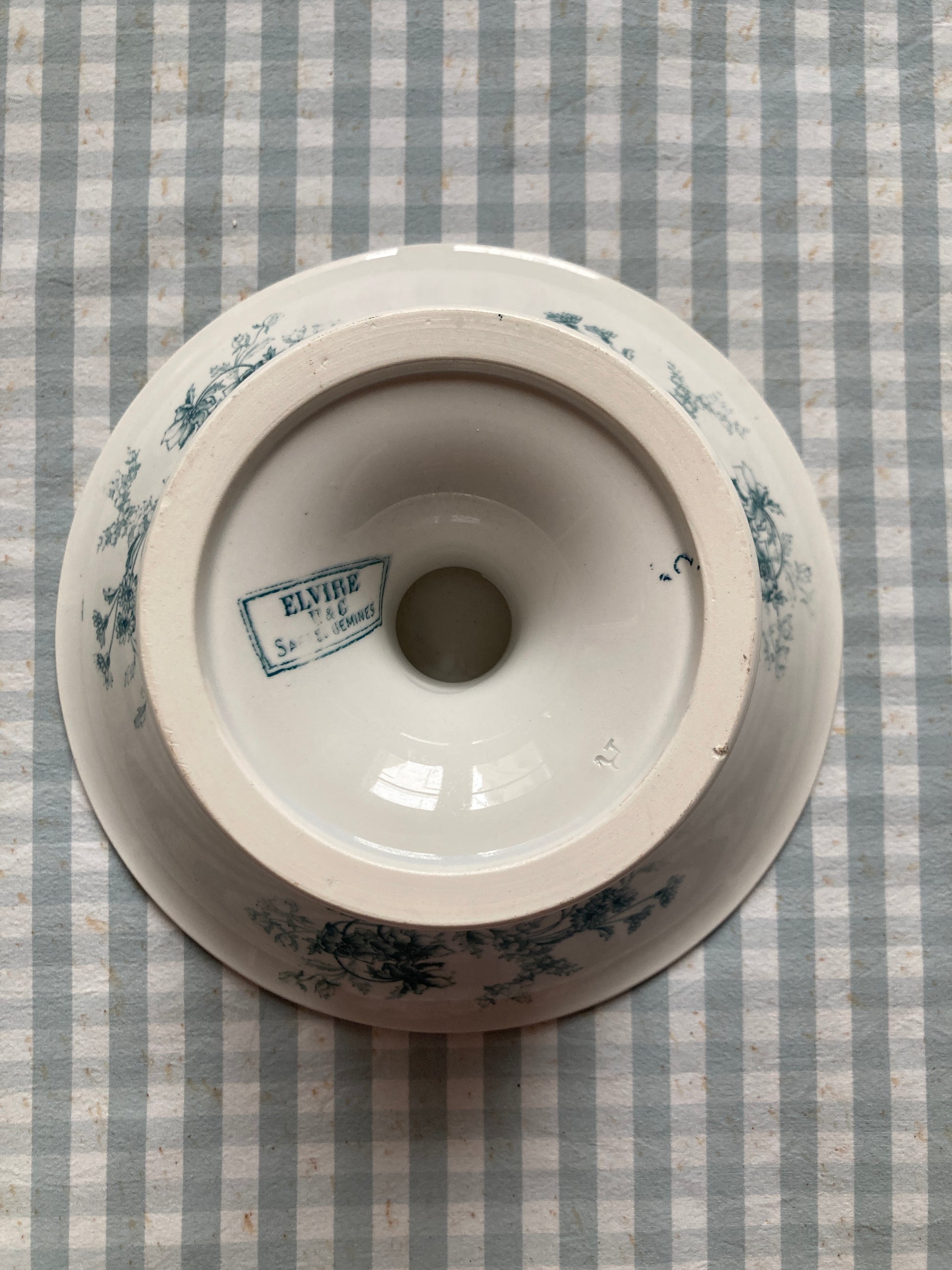 Le modèle « Elvire »est un modèle emblématique de la manufacture deSarreguemines, célèbre pour safaïence fine française. Ce décor se distingue par sonstyle romantique et floral, souvent orné demotifs délicats de fleursdans des tons doux (généralement vert, bleu, rouge ou brun sur fond crème). Produit entre lafin du XIXe et le début du XXe siècle, le service Elvire incarne l'élégance rustique typique de la vaisselle de cette époque.